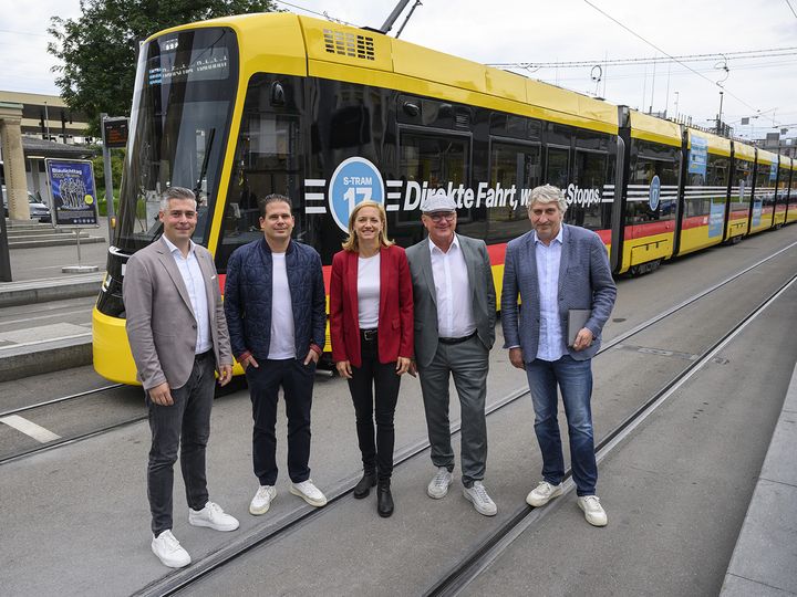 Anlässlich der Medienorientierung zum Infotram S-Tram 17 zeigten heute Morgen Regierungsrätin Esther Keller und Regierungsrat Isaac Reber die Vorteile des S-Trams 17 für die gesamte Region auf sowie die Notwendigkeit der Margarethenverbindung. Unterstützung erhielten sie dabei von Daniel Seiler, Geschäftsführer ACS beider Basel, Milan Sedlacek, Leiter Verkehr BVB, und Frédéric Monard, CEO BLT.