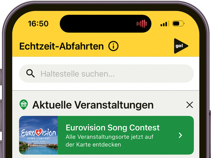 In der App können Sie sich neu im Menü «Abfahrten» unter «aktuelle Veranstaltungen» direkt über die ESC-Veranstaltungsorte und -anlässe informieren sowie Ihre Anreise mit dem öV inklusive Ticketkauf planen.